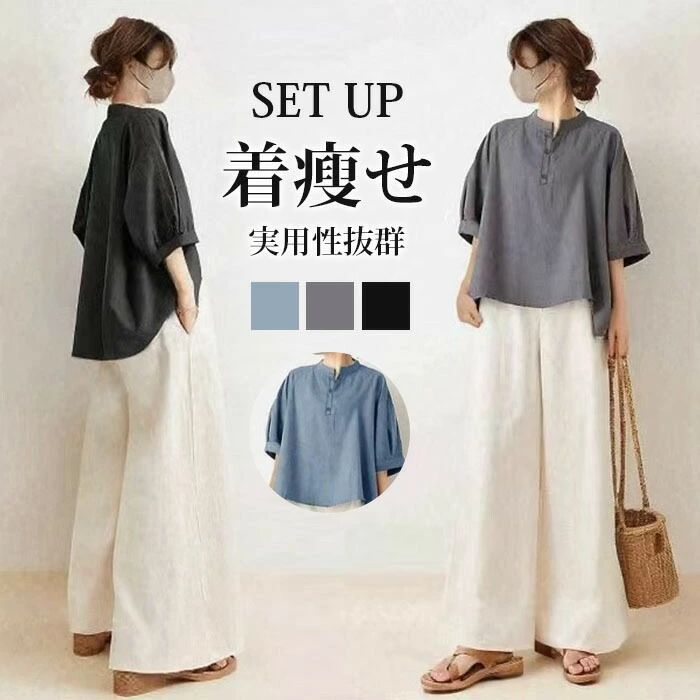 セットアップ ロングパンツ パンツドレス 五分袖 フレアパンツ ワイドパンツ ママスーツ レディース・・・