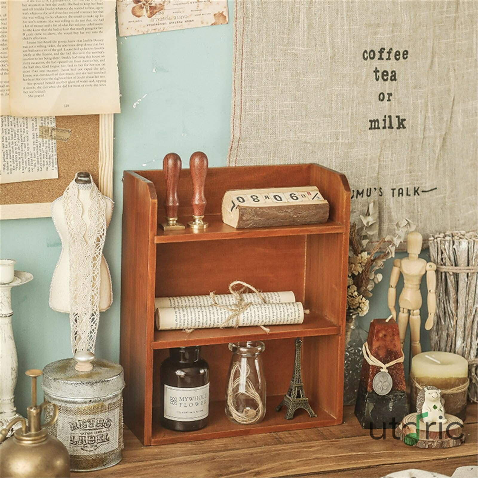 木製 デスクトップ収納ラック デスクトップカップ収納ボックス木製化粧品壁掛けヴィンテージ棚 卓上 小・・・