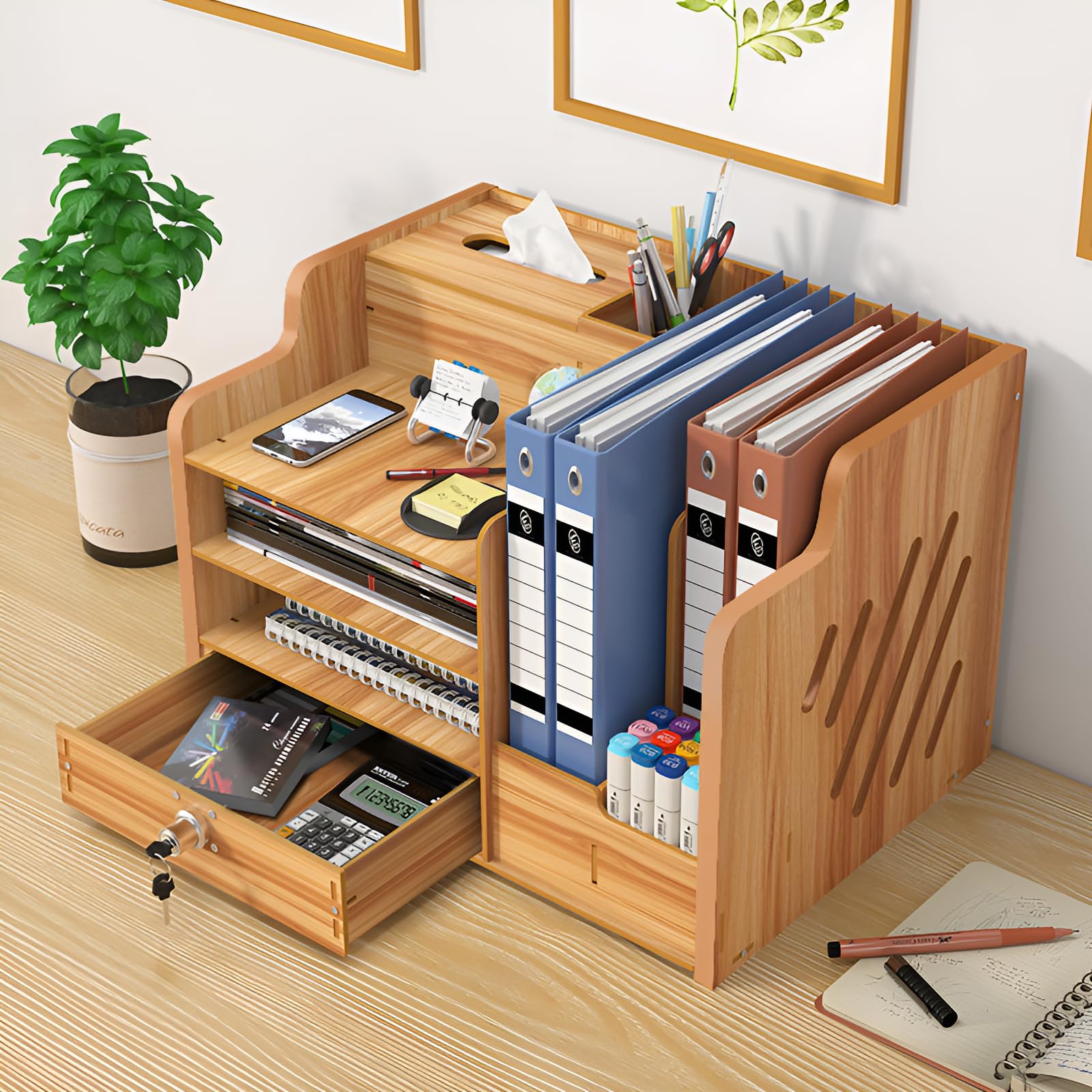 卓上収納 ラック 木製 書類ケース 事務用品 デスクオーガナイザー デスク上 ロック付き 収納 引き・・・