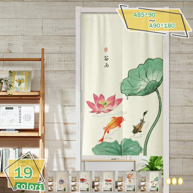 ロング のれん 遮光 玄関 階段カーテン 寝室 暖簾 柄 コイ ハスの葉 風雅 古典 プリント 柄 ドアのカーテン 壁飾り タペストリー 間仕切り 目隠し 引っ越し 脱衣所 半間のれん