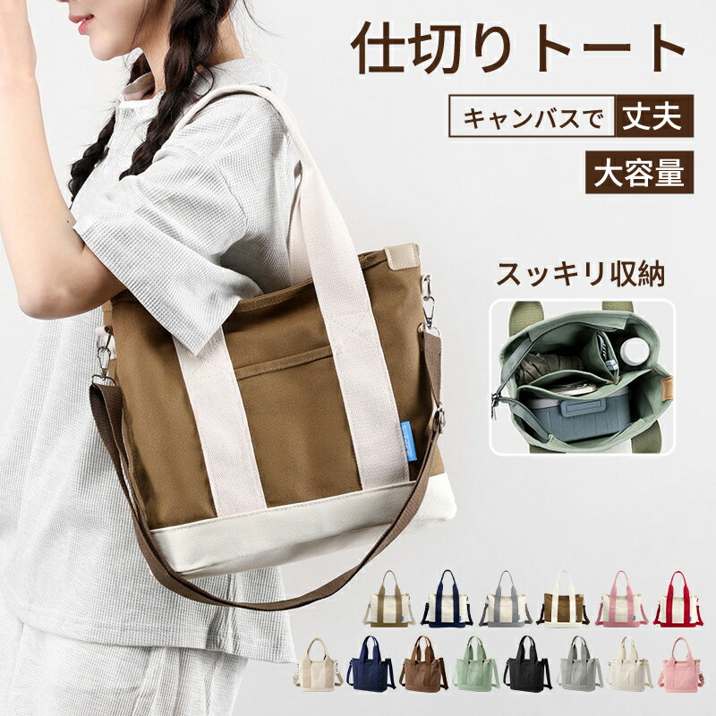 『送料無料』トートバッグ レディース キャンバス キャンバス生地 仕切り 大きめ 大容量 トート マチ広 軽量 マザーズバッグ ランチバッ