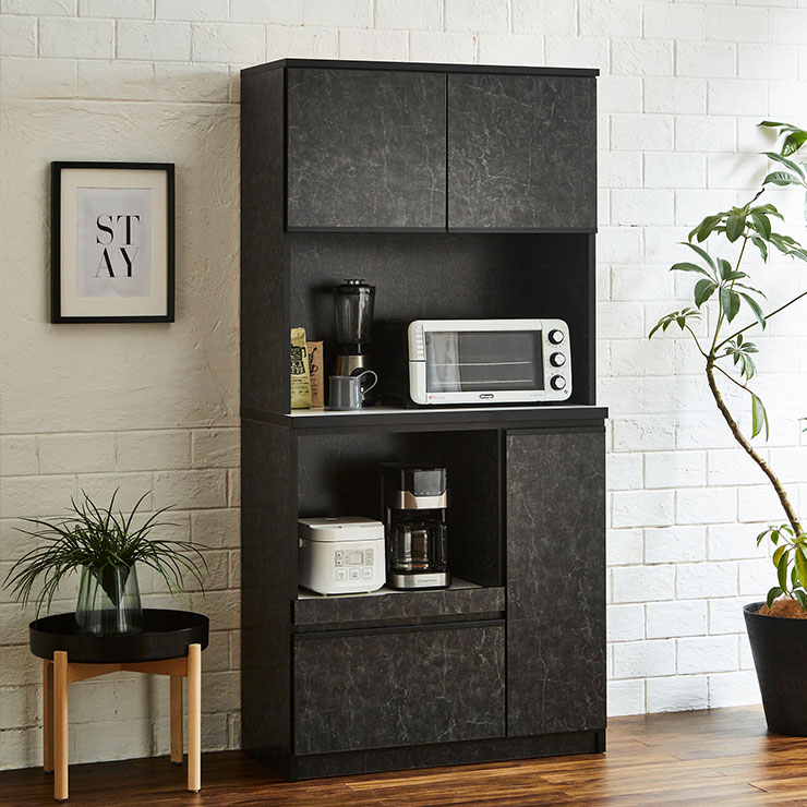 おしゃれ食器棚 レンジラック レンジ台 幅140 国産 大理石調 ストーン柄 黒 白 モダン レンジボード 家電収納 作業台 背面化粧仕上げ グレージュ 140cm幅 ROOM投稿キャンペーン