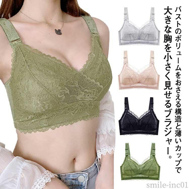 【送料無料】胸を小さく見せるブラジャー ノンワイヤーブラジャー 花柄レース ブラジャー 薄手 大きな・・・