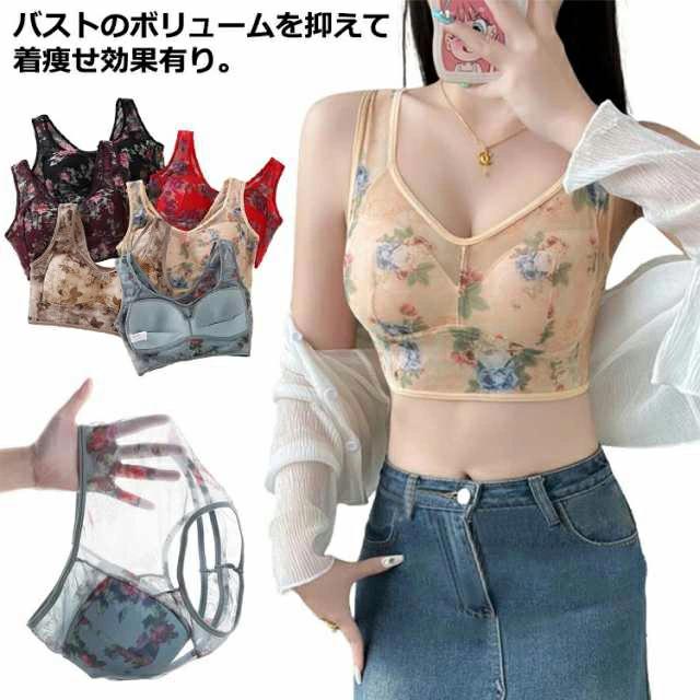 胸が小さく見えるブラ 胸を小さく見せるブラジャー レディース 総レース ブラジャー ノンワイヤーブラジャー 薄手 着痩せブラ 育乳ブラジャー
