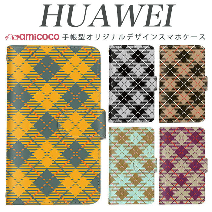 HUAWEI 手帳型 スマホケース ファーウェイ ふぁーうぇい 格子柄 シンプル 大人 すまほけーす・・・