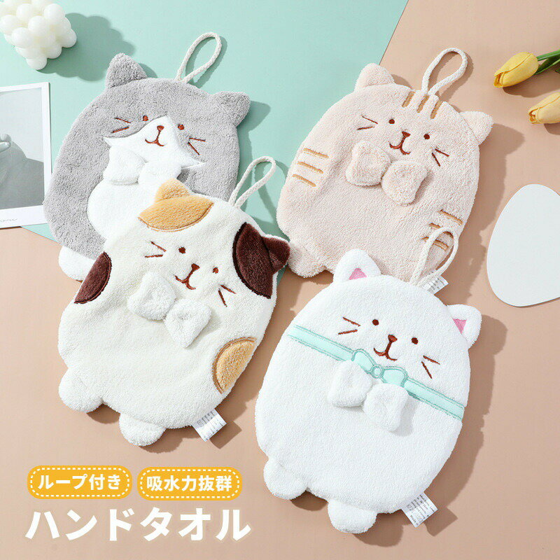 ループ付きタオル 手拭きタオル ハンドタオル キッチンタオル 可愛いネコ 猫柄 速乾ループタオル 女の子 男の子 家庭用 保育園 幼稚園 トイレ 洗面所 食器 ふきん ハンドタオル