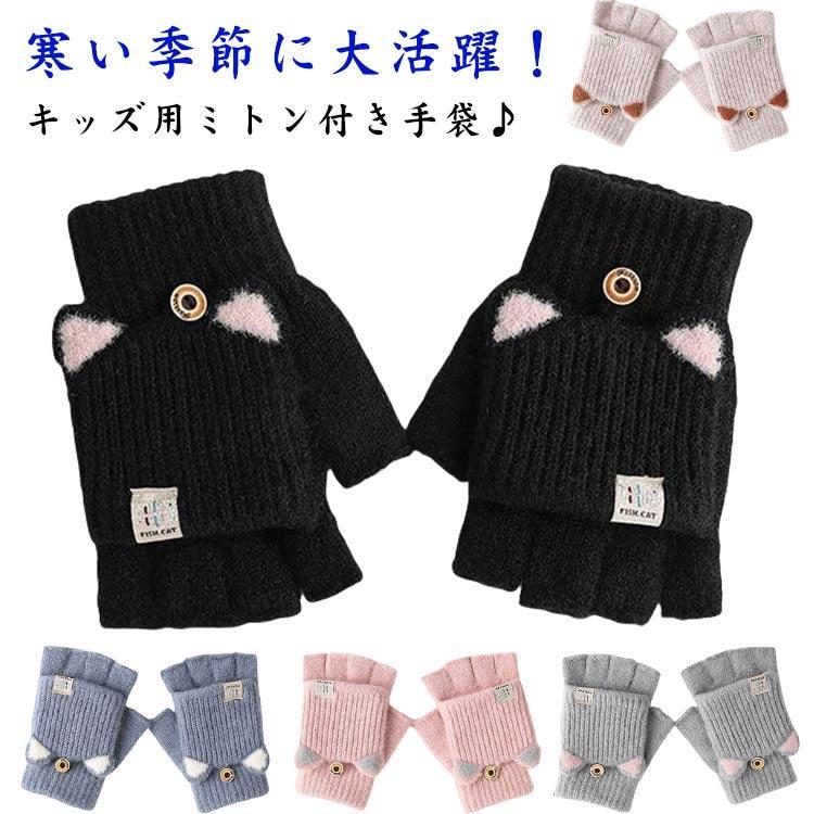 手袋 ミトングローブ 2WAY ニット キッズ 子供用 かわいい 指なし スマホ手袋 裏ボア 裏起毛・・・