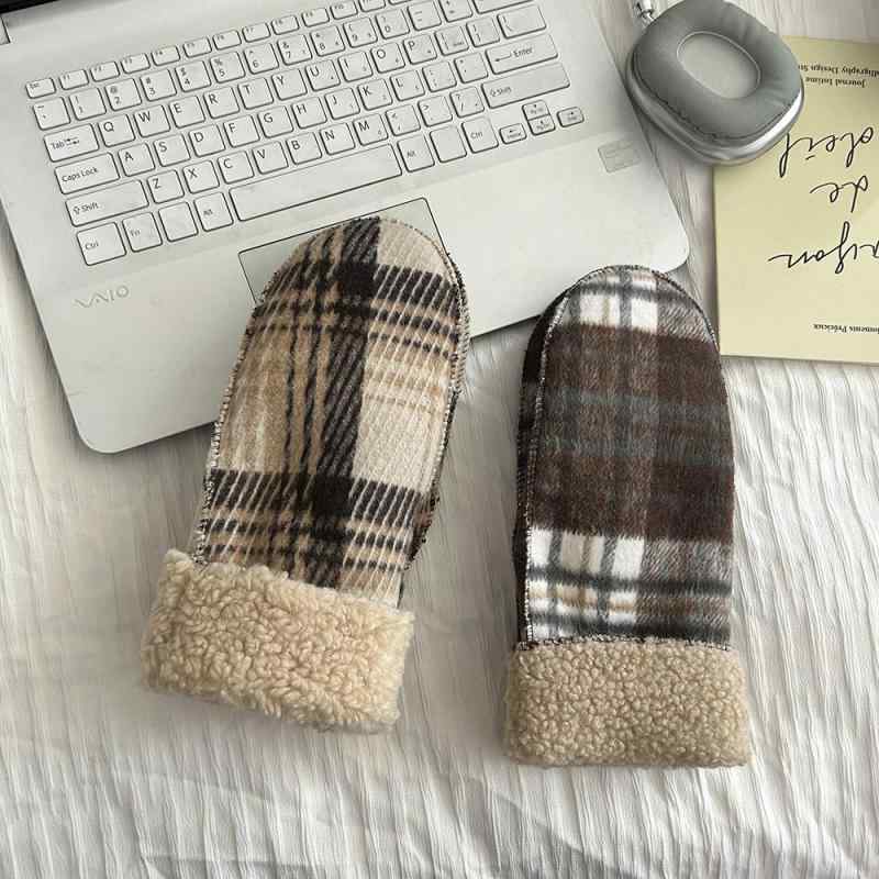 手袋 グローブ ボア ラムウール風 裏起毛 チェック柄 2WAY 指なし タッチスクリーン対応 防寒・・・