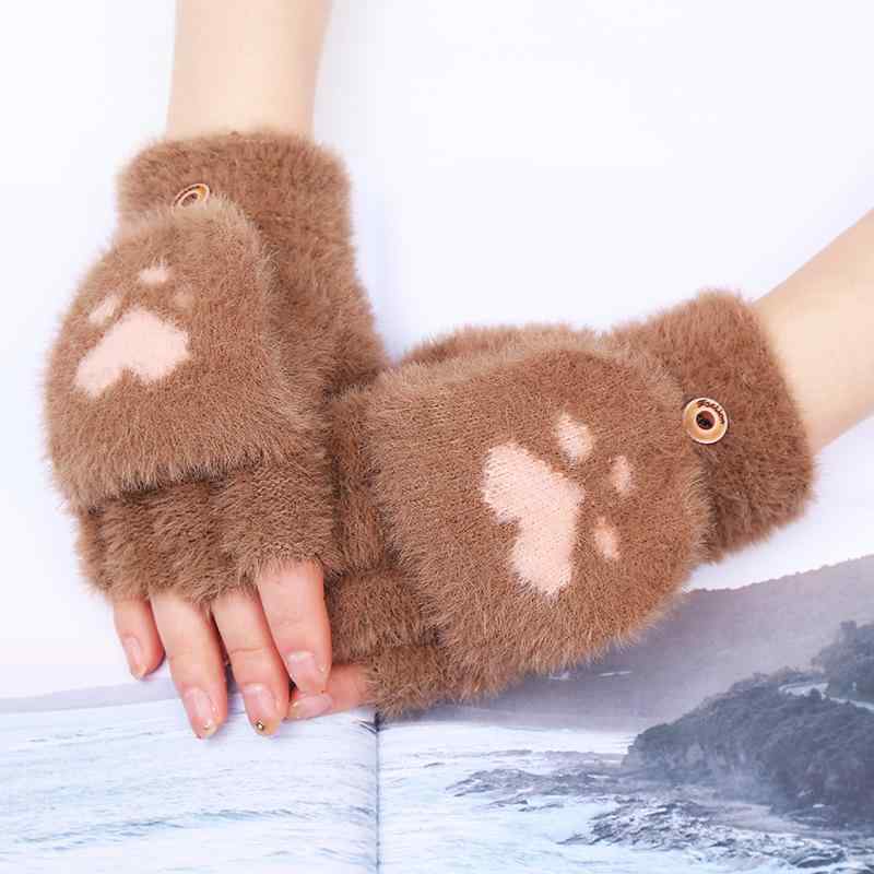 手袋 レディース 女性用 学生用 指なし 2WAY フリップカバー クマの手 猫の手 もこもこ ふわ・・・