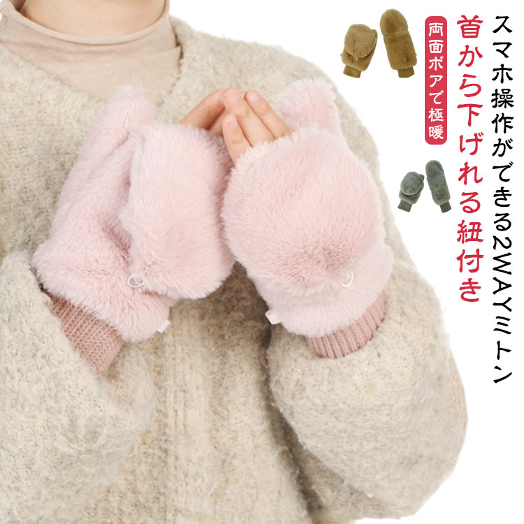 表も裏も ボア であったか極上の温もり 指先自由に、手を入れればまるで毛布! ストラップ付き 2WAY ファー手袋 ふわふわ かわいい 大人 カジュアル
