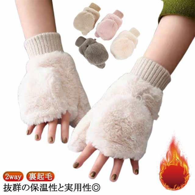 手袋 レディース 女性用 防寒 保温 もこもこ ボア 裏起毛 厚手 2WAY 指なし フリップカバー・・・