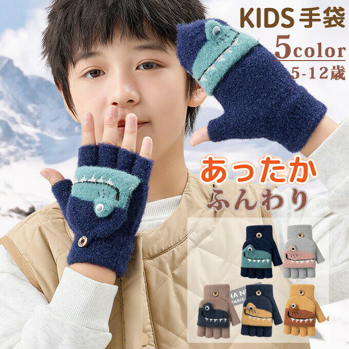 キッズ 手袋 ミトン こども ニット 手袋 男の子 女の子 子供 指なし グローブ 2way 恐竜 ・・・