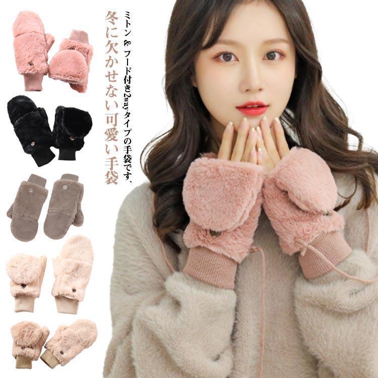 手袋 ミトン レディース 女の子 もこもこ ミトン手袋 指切り手袋 2WAY 指出し 裹起毛 ファー・・・