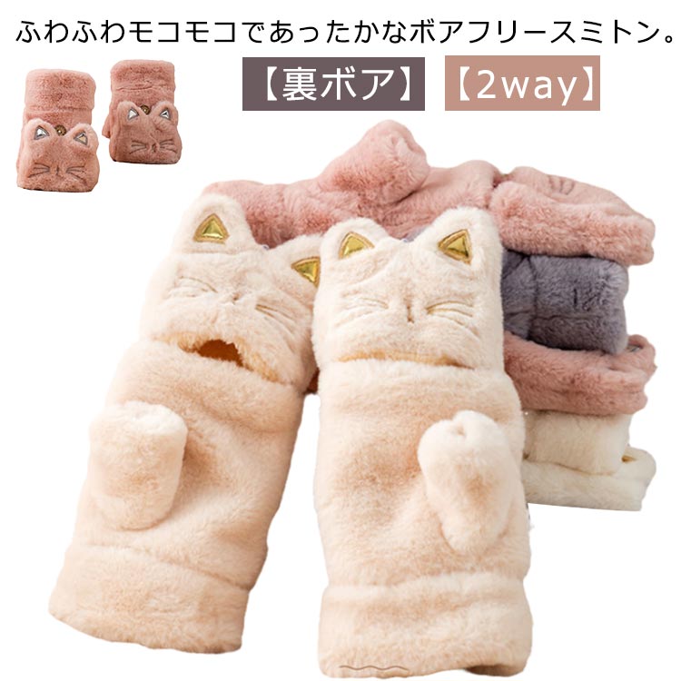 指なし てぶくろ レディース もこもこ ミトン 猫ちゃん ネコ耳 5本指 裏起毛 猫柄 ボアフリース・・・