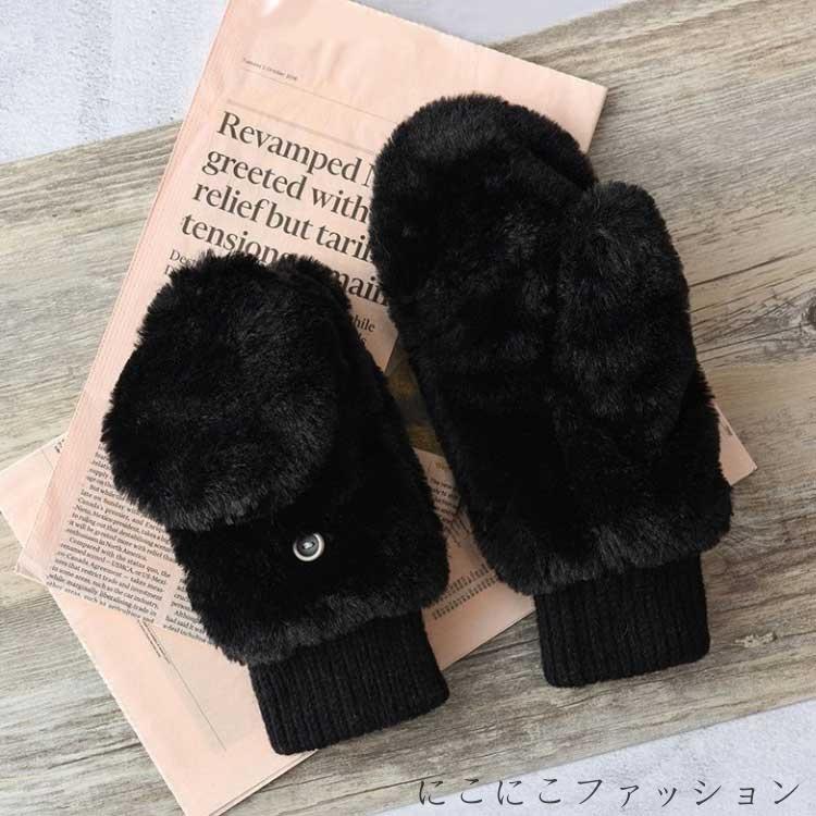 手袋 レディース 女性用 防寒 保温 もこもこ ボア 裏起毛 厚手 2WAY 指なし フリップカバー・・・