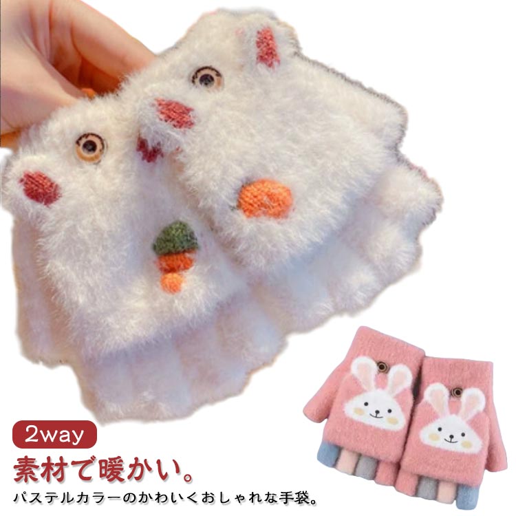 可愛い 手袋 指なし ニット ミトン もこもこ 暖かい 女の子 スマホ対応 うさぎ 猫 うさぎ ふわ・・・