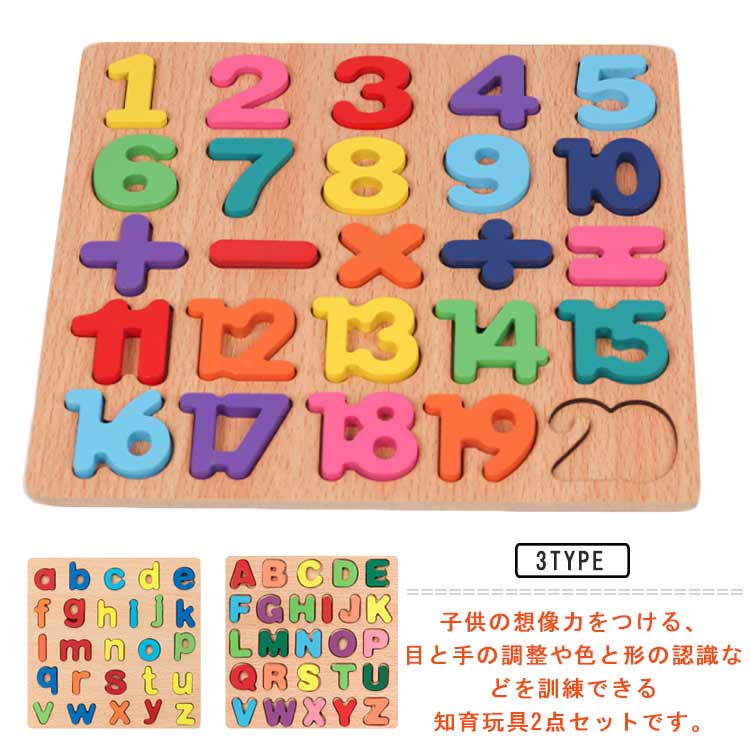 2枚セット 型はめパズル 木製 木のおもちゃ アルファベット パズル 英語 数字 木製パズル 木製お・・・