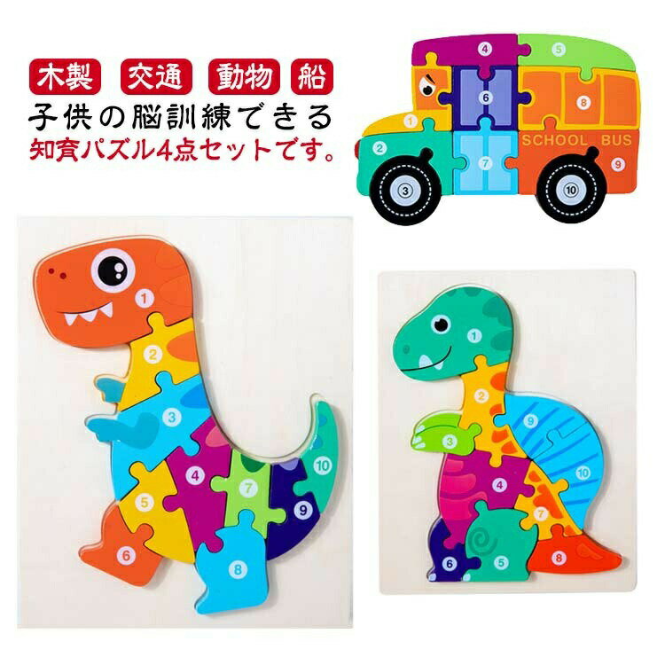木製 動物 パズル 4点セット 木のおもちゃ 木製おもちゃ 型はめ 木製パズル 大きいサイズ 交通 ・・・
