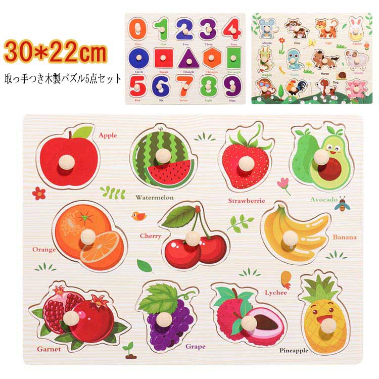 果物数字知育玩具木のおもちゃ子供取っ手付き5点セットベビー型はめパズル木製パズル立体パズル木のパズル・・・