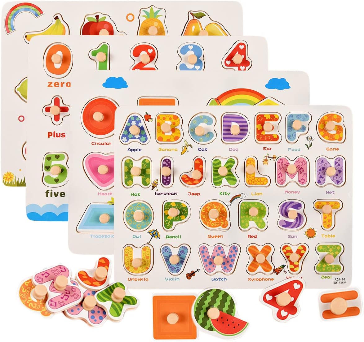 木製パズル 4種類シリーズ 型はめパズル モンテッソーリ パズル 数字学習 図形認知 A・B・C 英・・・