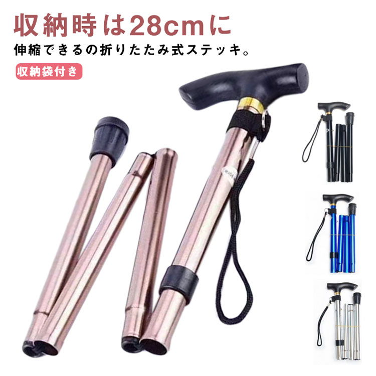軽量アルミニウム製の伸縮ステッキ 収納時28cmのコンパクト設計 5段階高さ調節可能