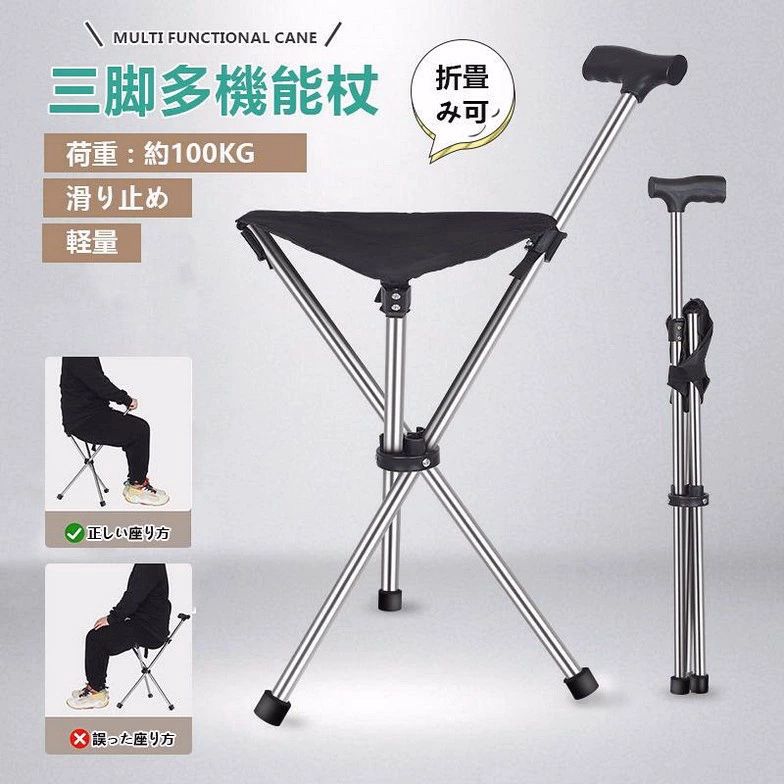 2in1 椅子に変身できる杖 多機能設計 登山 散歩 アウトドア 老人 休憩 介護 軽量 コンパクト 便利 旅行 座れる杖 椅子付き杖 椅子 3本脚 ゴルフ