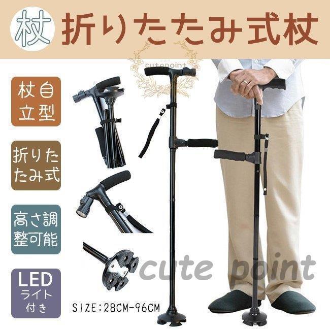 送料無料 折りたたみ杖 頑丈 つえ 介護 四点支持 軽量 女性 男性用 杖 自立式 長さ調整可能 伸縮 ステッキ 歩行支援 多機能 クレバーケーン杖 SOS 補助ハンドル LEDライト