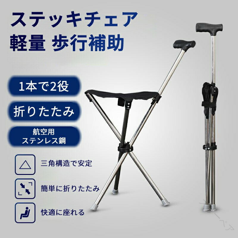 軽量でコンパクトな折りたたみステッキチェアは女性や介護用に最適歩行補助や休憩に便利な三脚仕様の椅子です