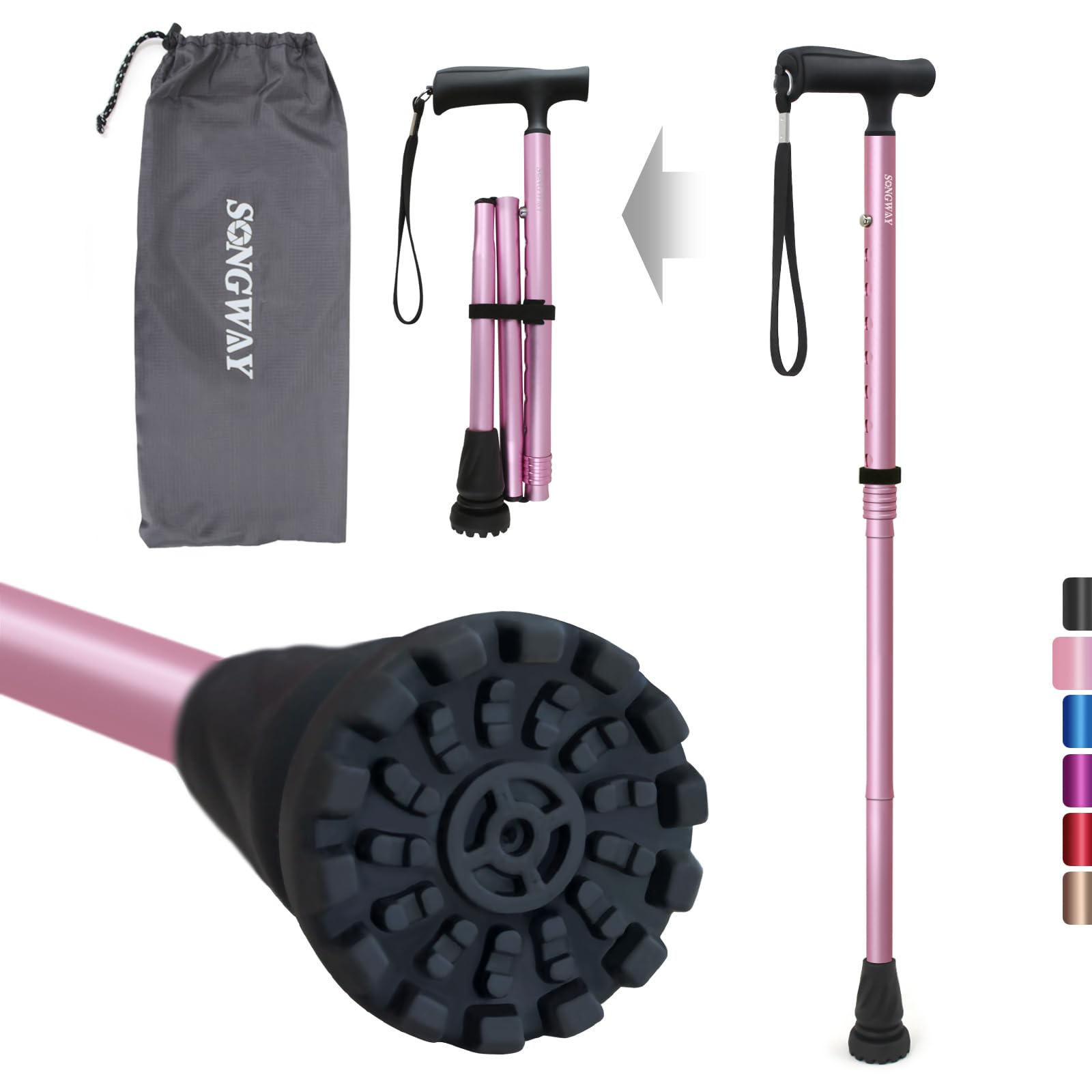 送料無料 SONGWAY 杖 女性用 男性用 ステッキ おしゃれピンク 折りたたみ 軽量 安定感抜群 手触り良好 ハンドル調節可能