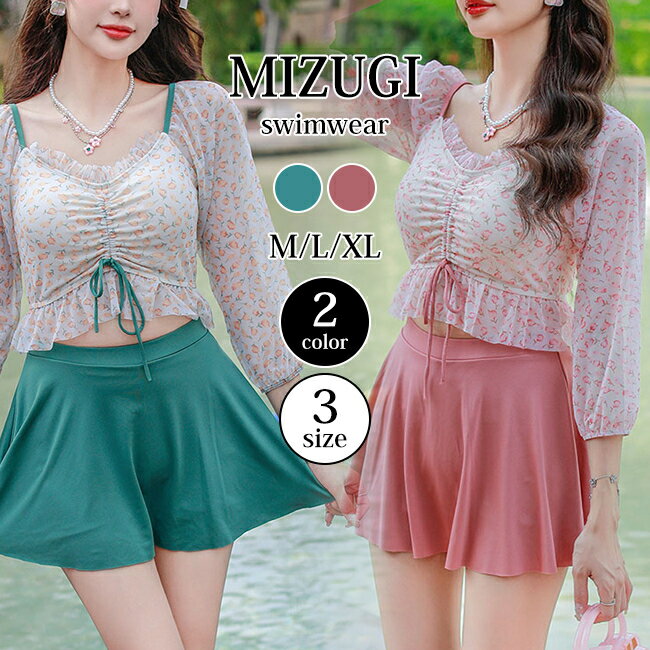 水着 レディース ビキニ 2点セット 花柄 体型カバー リボン ハイウエスト スカート 7分袖 スカ・・・