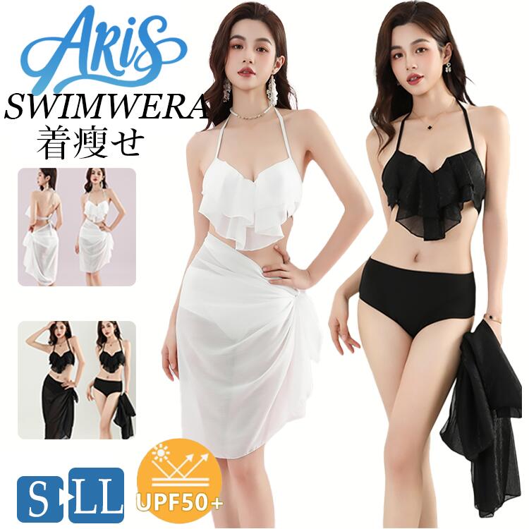水着 レディース 体型カバー水着 ビキニ パレオ付き3点セット タンキニ オトナ女子 小胸 盛れる 脚 お腹 お尻 太もも カバーアップ 脚長効果 露出控えめ