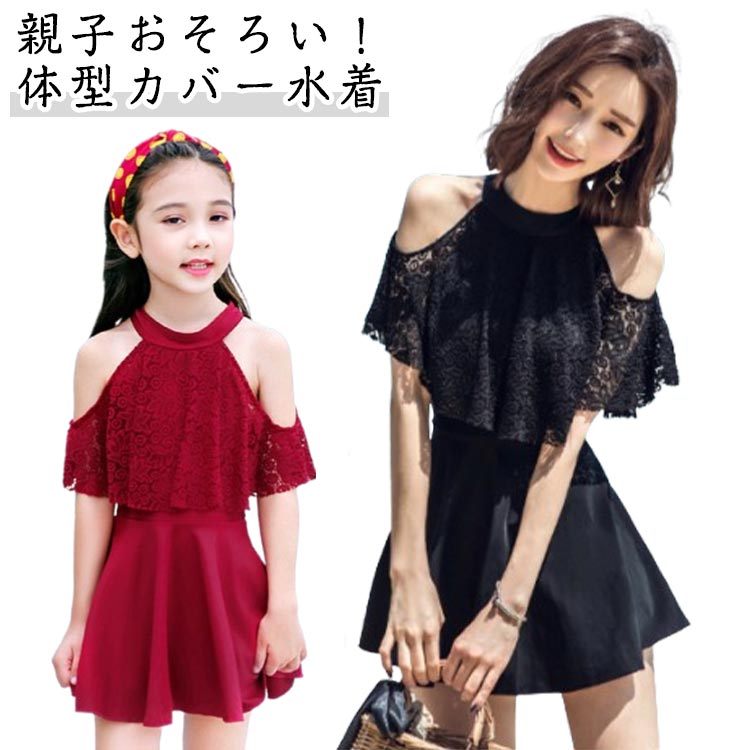 送料無料 水着 体型カバー ワンピース オフショルダー レース 女の子 子供 大人 ホルターネック 小学生 中学生 高校生 かわいい お洒落 セクシー 親子 ペアルック おそろい 露出控えめ