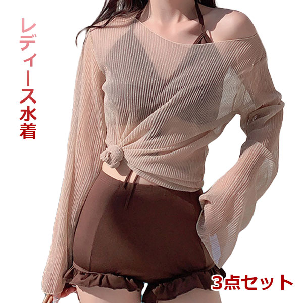 水着 レディース ビキニセット 3点セット ホルターネック 無地 スイムドレス 透け フリル セパレート パッド入り 盛れる レディース