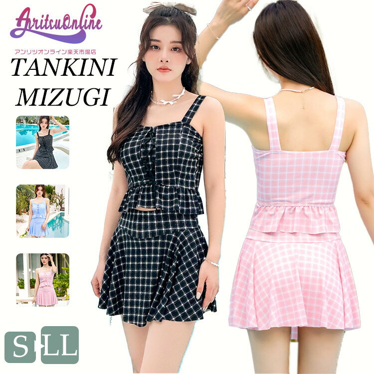 【フィットネス水着】3点セット ビキニタンキニ上下セット レディース チェック柄 スカート 体型カバ・・・