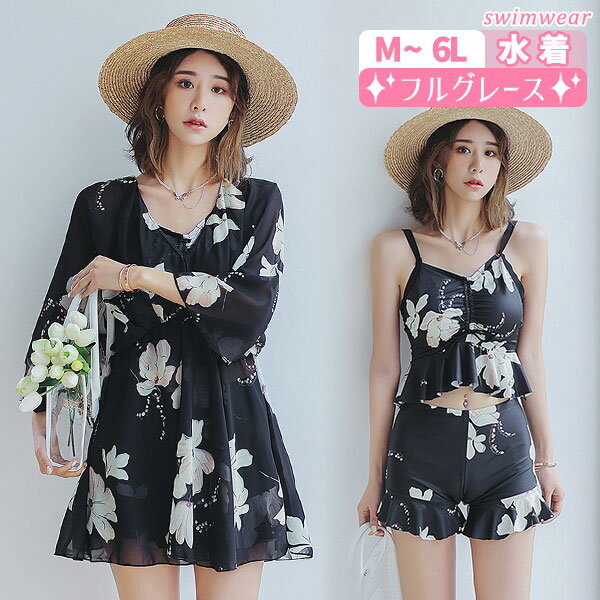 3点セット水着大きいサイズぽっちゃりレディースぽっちゃり水着袖あり体型カバー韓国可愛いかわいい花柄ハ・・・