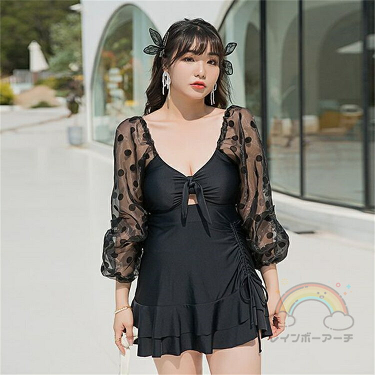 体型カバー水着 ワンピース水着 2点セット ワンピ ママ水着 女性用 かわいい ブラック 透け感あり