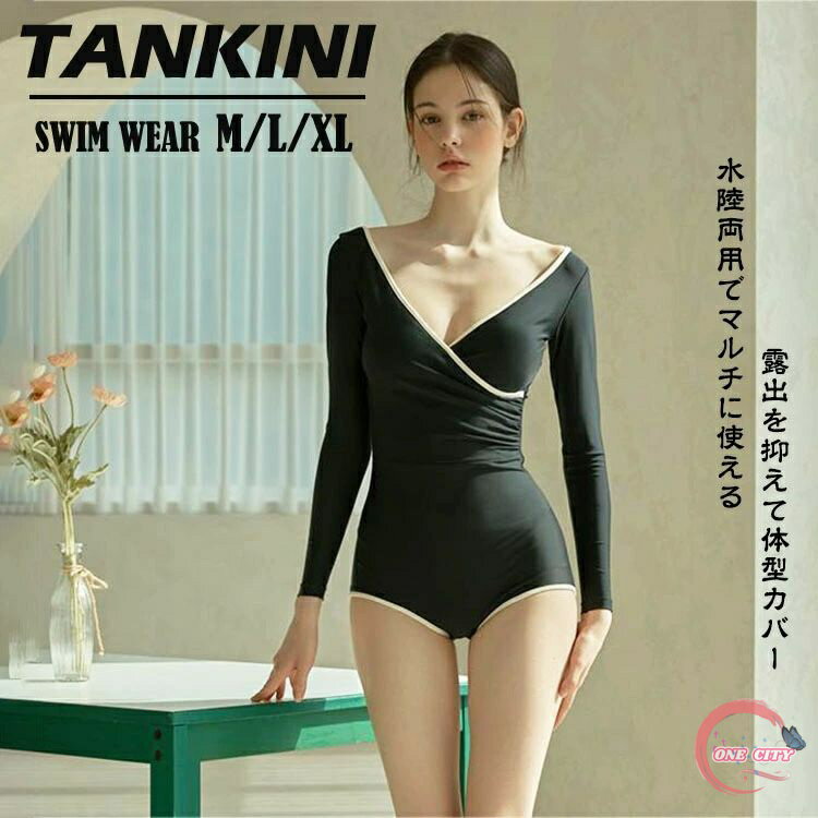 水着 韓国 露出控えめ オールインワン 高校生 レディース 水着流行り タンキニ ビキニ 体型カバー 長袖 UVカッド 二の腕 太もも カバーアップ 温泉 海 休み 沖