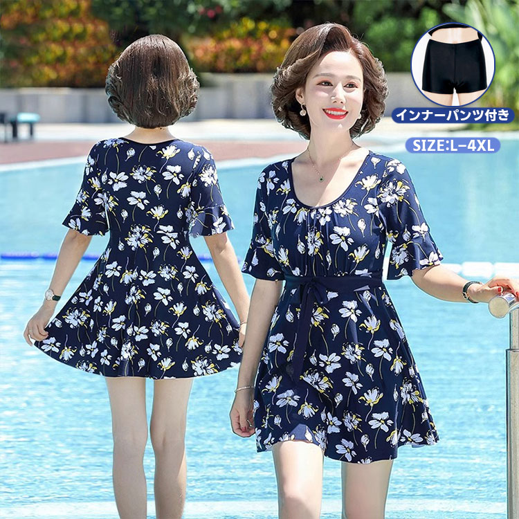 ママ ワンピース 水着 レディース 40代 50代 60代 70代 体型カバー 大きいサイズ スイム オールインワン 花柄 温泉 水着