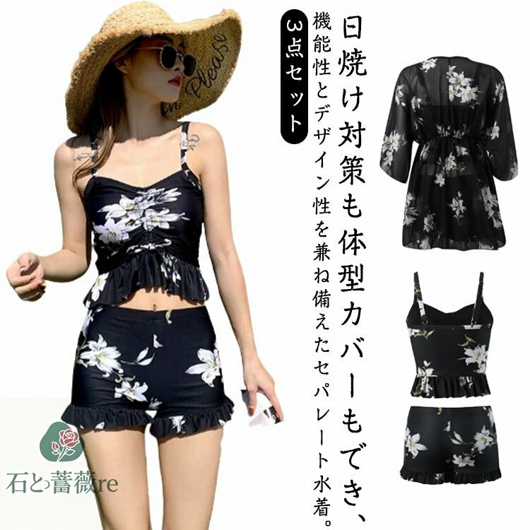 タンキニ ラッシュガード 温泉 ハーフパンツ 大人可愛い 3点セット 長袖 水着 セパレート ワンピ・・・