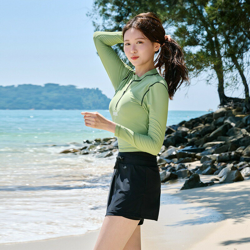 スポーティでファッショナブルな長袖セパレート水着。体型もカバーし、リゾートやプールで快適に着られるシンプルで着やすいデザインです。
