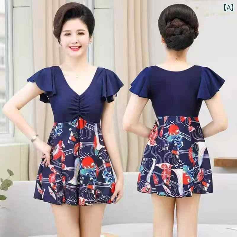 水着 レディース シニア ワンピース vネック 一体型 タンキニ 大きいサイズ ママ 保守 中高年 温泉 お母さん スイムウェア