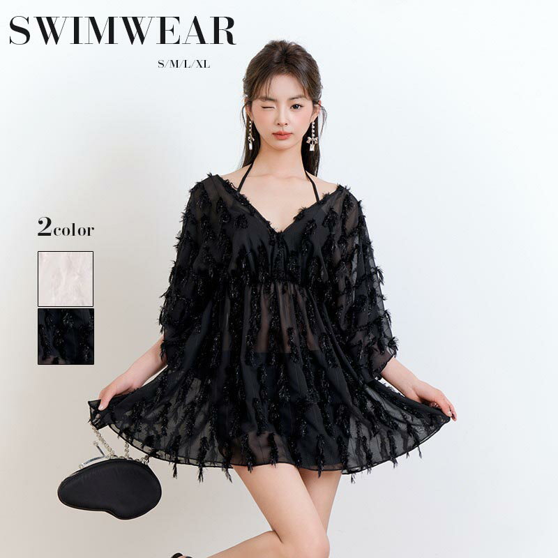 送料無料 水着 新作 クロスバンドゥ無地 3点セット レースパーカー付き UVカット 刺繍 上下セッ・・・