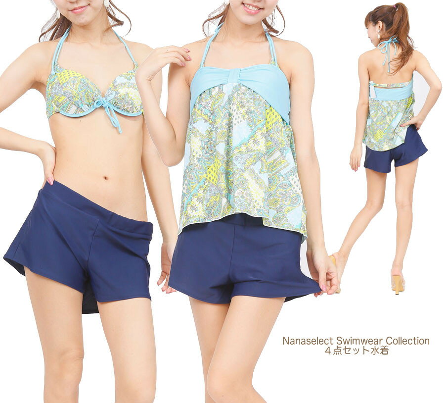 水着体型カバータンキニビキニサーフパンツレディースセパレート4点セットカバーアップタンキニ水着体型カバー水着ホルターネック日焼け防止ママ盛れる送料無料