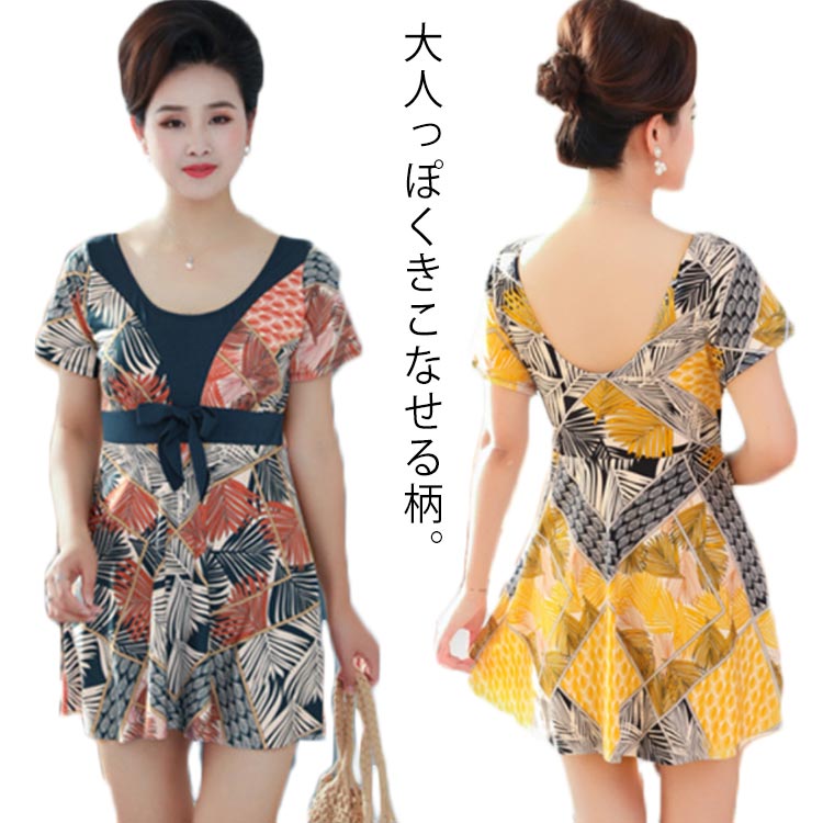 ワンピース水着 体型カバー水着 レディース ミセス ママ水着 20代 30代 40代 50代 60代 オールインワン 可愛い カバーアップ バックシャン 大きいサイズ