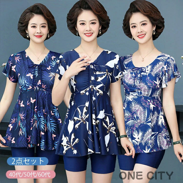 水着 レディース ママ水着 露出控えめ 温泉 セパレート 2点セット 花柄 ワンピース ショートパン・・・