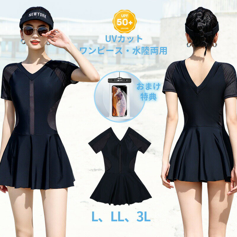 水着体型カバー ワンピース水着 大きいサイズ かわいい お洒落 日焼け対策 女性用 大人 半袖 ぽっちゃり ミセス オトナ女子 オールインワン スイムウェア みずぎ ブラック黒 露出控えめ