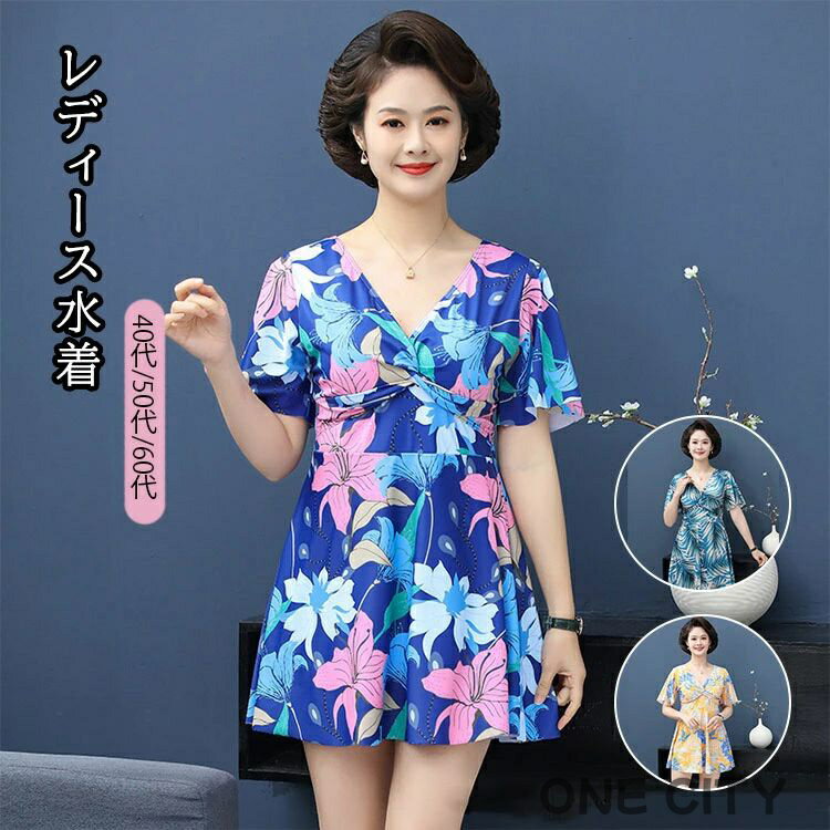 ワンピース水着 レディース 50代 60代 大きいサイズ 水着 体型カバー 半袖 花柄 スイムウェア・・・