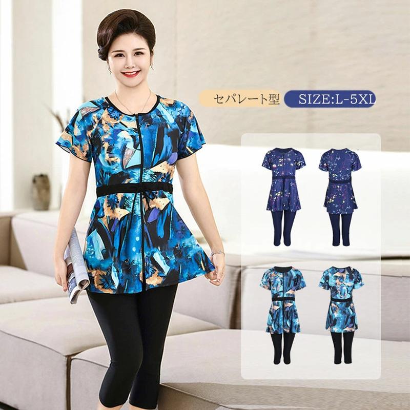 レディース 水着 シニア セパレート ワンピース水着 フィットネス水着 2点セット 七分丈パンツ 体・・・