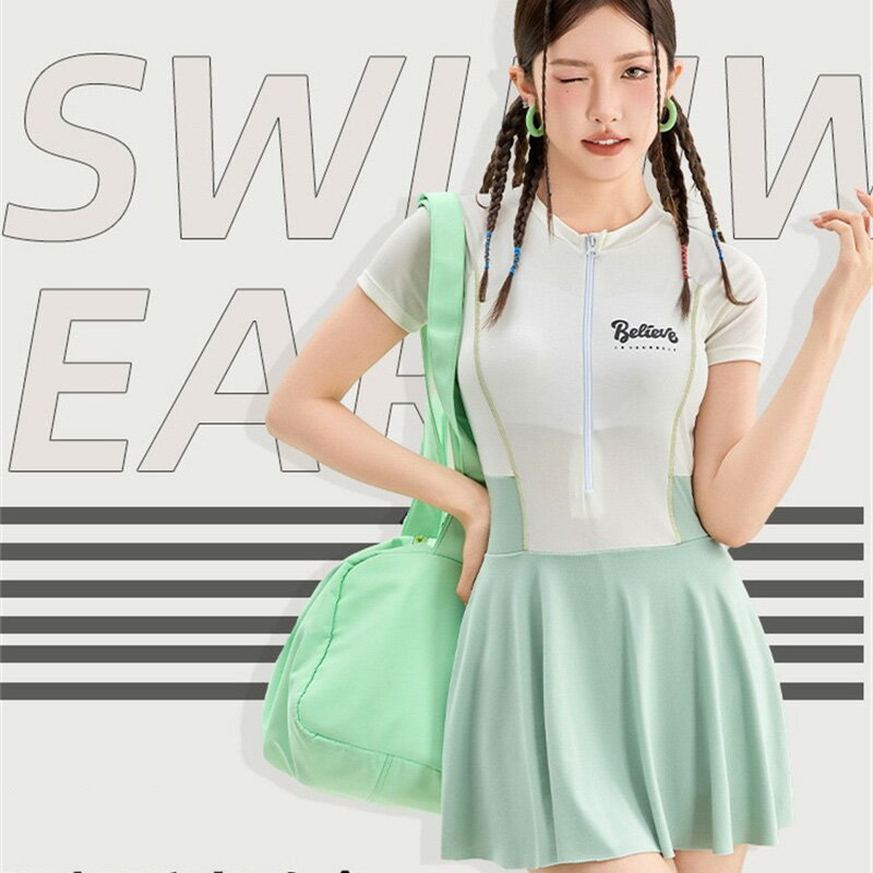 60代 50代 40代 30代 20代 10代 ママ 女性 可愛い お洒落 グリーン/ブラック/ブラウンワンピース水着 女性 S/M/L/XL 袖付き フラットスカート