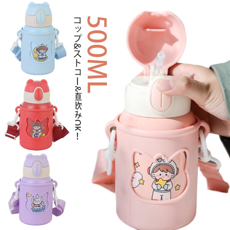 ステンレス 通学 キッズ 保冷 保温 水筒 魔法瓶 500ml ショルダーベルト ストローボトル ストロー 幼児 子供 子ども かわいい 保育園